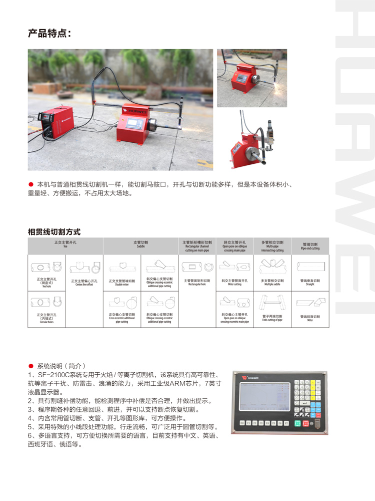 BXG-250J便攜式數控管子切割機是一種數字程序控制的現代化切割設備,可以將圓管截斷,在圓管上切割各種形狀及相貫線的切割操作 ,它還具有自動化程度高、切割精度高、材料利用率高、生產效率高等特點。隨著機械電子技術和計算機技術的進步,數控切割機以其良好的人機對話操作界面、強大的輔助支持功能以及相對很低的設備投資,正被越來越多的企業所重視,在生產中得到越來越廣泛的應用