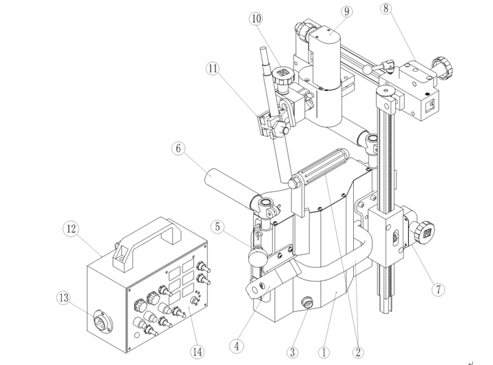 11)焊槍夾持器:是焊槍的夾持裝置,可以方便地進(jìn)行維修、調(diào)整和焊槍的拆卸