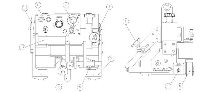 11.金屬插座:此插座為外接電纜插座。此電纜負責小車與送絲機的連接及電力供應。(電纜的另一端有兩個分支,一個接送絲機,另一個接電源。)