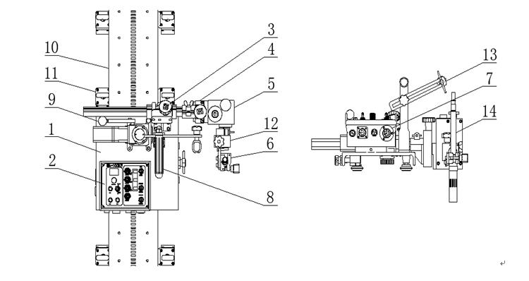 12焊槍微調(diào)裝置:用此裝置可準(zhǔn)確引導(dǎo)焊槍對準(zhǔn)焊接部位。