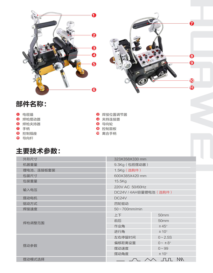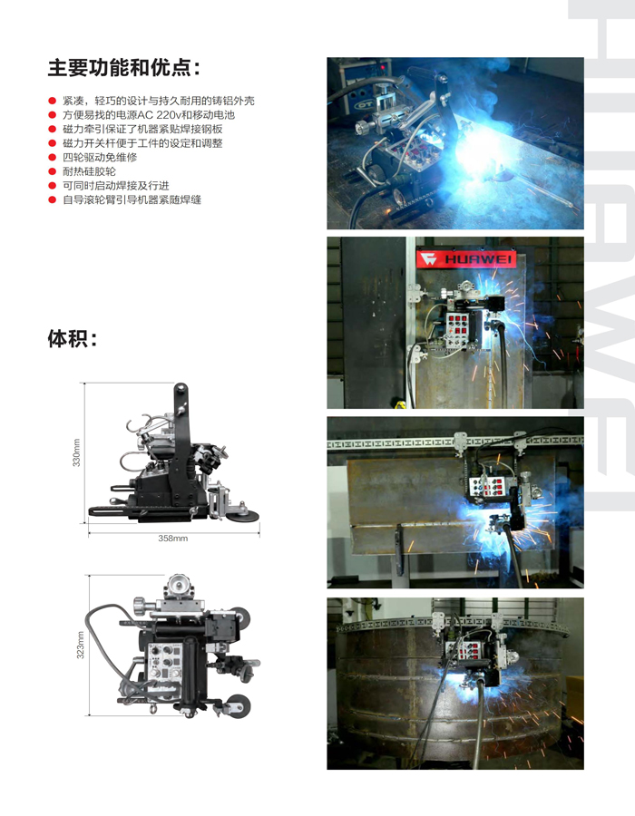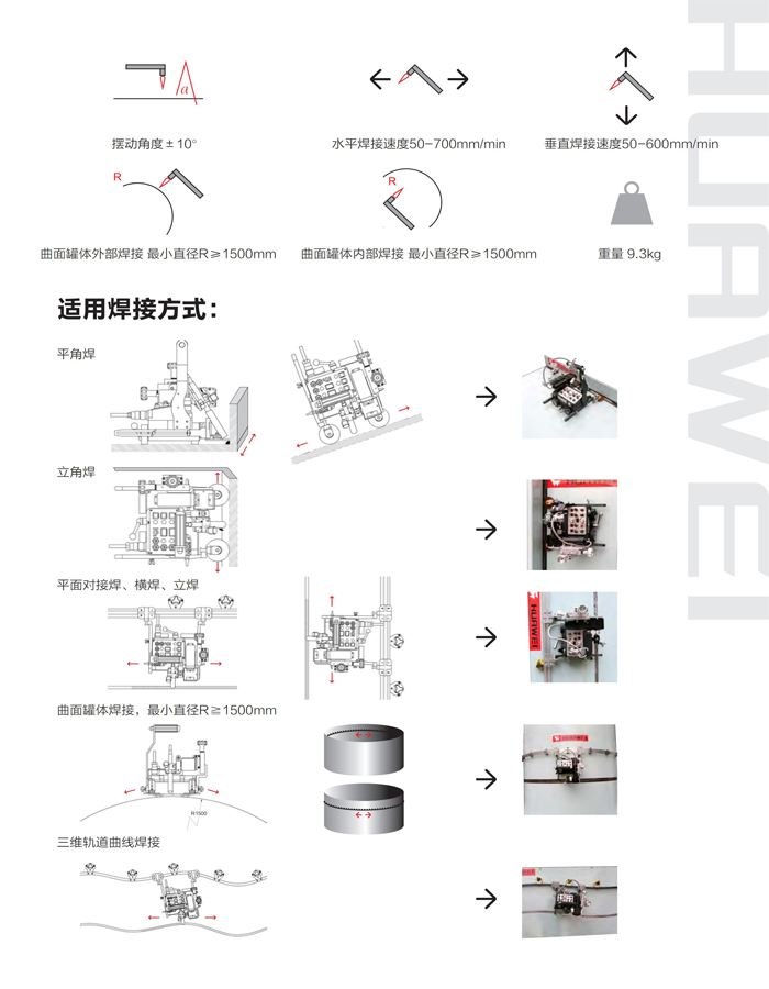 減少勞動強度,改善作業(yè)環(huán)境。提高工作效率,是手工焊的1.5倍。避免人為因素所造成的焊縫質量不良,一般的手工操作的不良率在20%左右,而采用自動焊接小車沒有產生焊接不良率, 因此其綜合效益,比手工焊提高近200%。自動化程度高,確保焊接質量的穩(wěn)定性。非熟練的技術工人也能快速掌握:HK-7W-F全位置擺動式自動焊接小車是在標準角焊機的基礎上,為獲得較大的焊縫尺寸并且一次成型而開發(fā)出來的帶擺動器的焊接小車。它兼有標準角焊機簡單輕便的特點,又能進一步提高焊接效率。