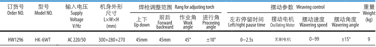 HK-6WT 擺動焊角焊小車一體化機身,堅固耐用,輕巧便攜。低重心設(shè)計,小車具有16kg拖力,能夠穩(wěn)定爬行。設(shè)有磁控手柄,移動手柄時可以減少部分磁吸力。容易安裝。可以左右兩方向焊接,小車兩端均安裝有感應(yīng)開關(guān),焊接結(jié)束后小車可以自動停止。具有收弧功能,提高收弧處的焊縫質(zhì)量。該機具有擺動功能,有不同規(guī)格的焊道方式可供選擇。擺動幅度,擺動角度,中心偏移位置和左右停留時間, 均可數(shù)字輸入。數(shù)碼管顯示各種調(diào)整數(shù)據(jù),大大縮短設(shè)置時間。 擺動模式可供選擇。