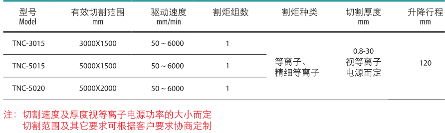 TNC系列等離子切割機采用一體式結構,輕量化設計,使得安裝迅速方便。機器縱向采用雙邊同步驅動,直線導軌導向,橫梁采用輕型結構設計,剛性好,重量輕,慣量小,使得運行更加平穩。配有水槽式除塵切割臺。以達到環保要求,也可根據用戶要求設計抽煙式除塵切割臺。本機特別適用于碳鋼以及不銹鋼,鋁等有色金屬的薄型板材的高速切割,也適用于中厚板的切割。